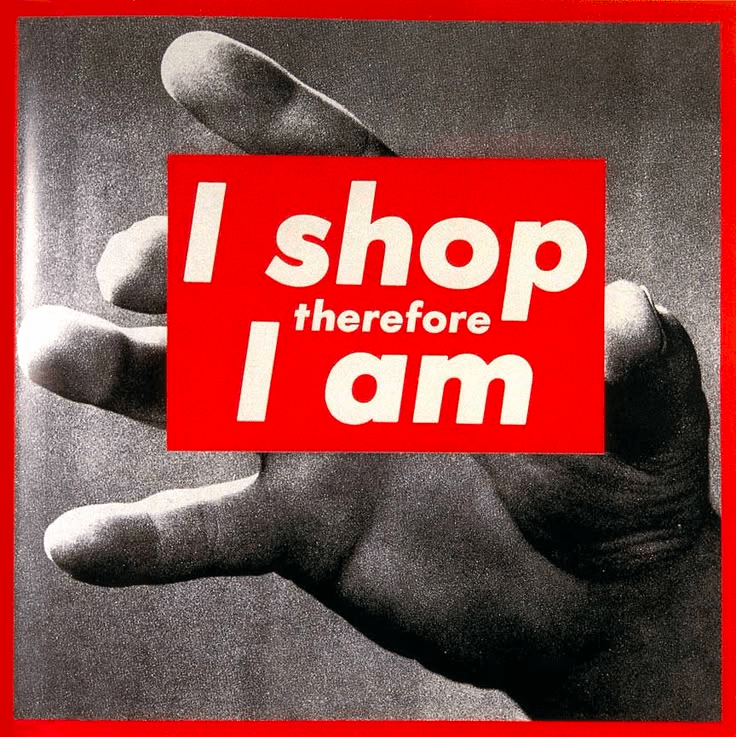 I clearly remember the first time I saw Barbara Kruger’s iconic photolithograph, I shop therefore I am (1990). As a rewriting of French philosopher René Descartes’ (1596-1650) seminal statement, I think therefore I am (Cogito ergo sum), it is a powerful and symptomatic reflection of modern consumerism.